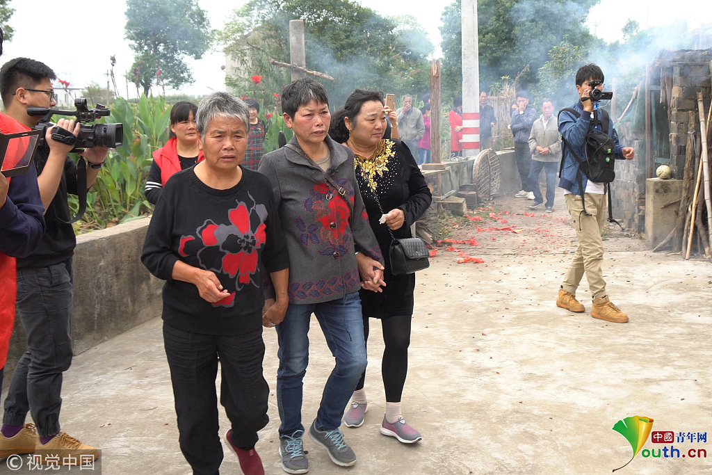 2018年10月14日,浙江嘉興嘉善縣陶莊,二姐何好妹(左)攙扶著何永妹(中)回家。圖片作者:田建明