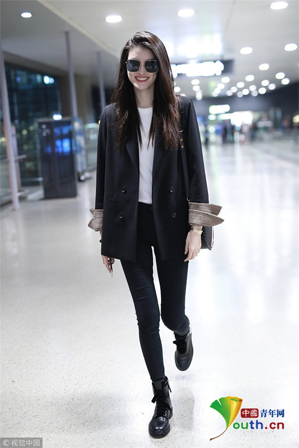 2018年10月15日,上海,何穗亮相機場。她身穿深色西裝搭配黑色緊身褲大秀超模身材,簡約造型依舊高級感十足,輕撩秀發(fā)散發(fā)女人味。