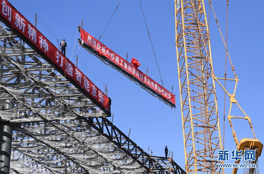 10月17日,工作人員在吊裝最后一組鋼梁。當(dāng)日,京張高鐵新建車站——清河站主體結(jié)構(gòu)正式封頂。清河站是京張高鐵建筑面積最大的車站,同時(shí)也是京張高鐵在北京地區(qū)的始發(fā)站之一。 新華社記者 張晨霖 攝