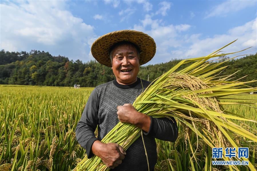 10月17日,種植戶(hù)陳元生抱著收獲的稻子。