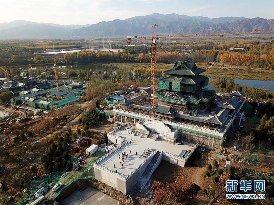10月18日拍攝的建設(shè)中的北京世園會永寧閣(無人機(jī)拍攝)。 新華社記者 羅曉光 攝