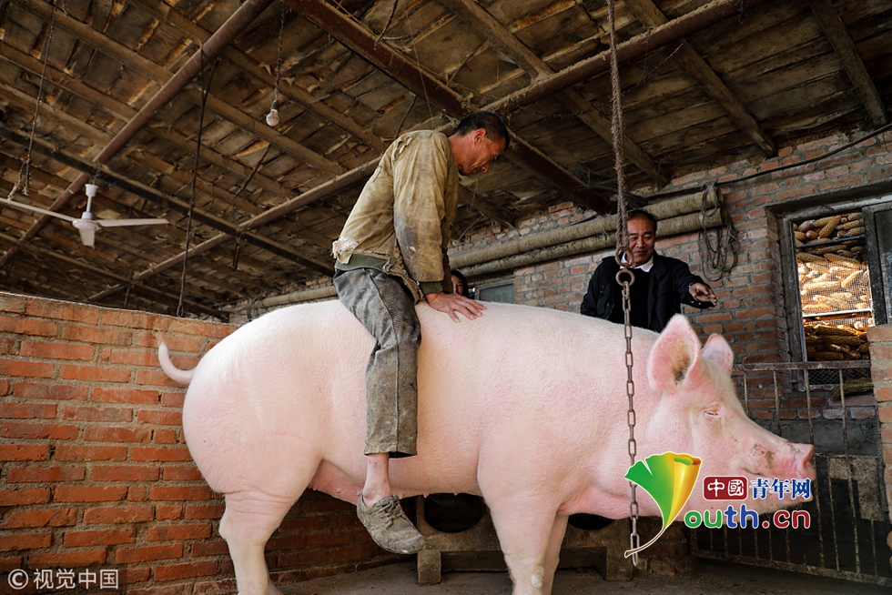 2018年10月16日,遼寧丹東,900斤重的大豬,堪稱(chēng)豬中巨無(wú)霸,豈不是炙手可熱的網(wǎng)紅一枚?大小老板還不得帶上銀子蜂擁而至?然而,今年不行了,受遼寧多地豬瘟疫情影響,900斤大豬無(wú)人問(wèn)津。本想靠著這頭巨無(wú)霸大豬刷爆朋友圈甚至賣(mài)個(gè)大價(jià)錢(qián)的養(yǎng)豬人張先生,現(xiàn)在非常擔(dān)心一頭好豬爛在手上。10月16日,遼寧丹東。當(dāng)著來(lái)圍觀(guān)的鄉(xiāng)親的面,養(yǎng)豬人張先生小心翼翼地騎上了豬背,希望用這樣的造型求關(guān)注。