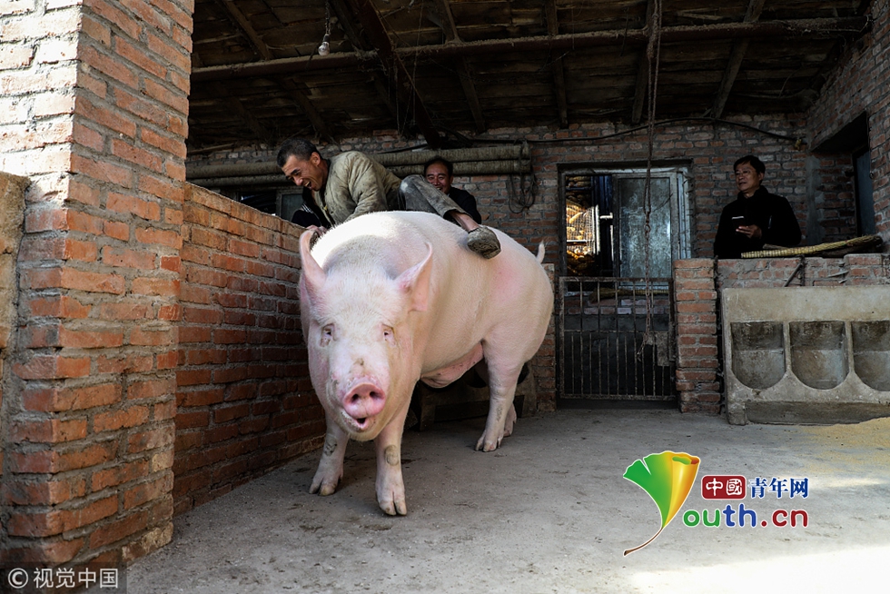 村里一位83歲的老人在圍觀時說,活了一輩子第一次見到這么大的豬,豬是好豬,但是賣不出去愁人啊。900斤大豬是個什么概念?體長2米25、腰圍1米75,站立高度1米10。此時此刻,900斤大豬完全不知主人的苦,也完全不知道外面的世界發(fā)生了什么。圖為養(yǎng)豬戶張先生險些從900斤大豬背上摔下來。圖片作者:棋簿紫/視覺中國