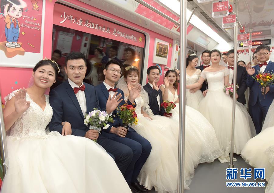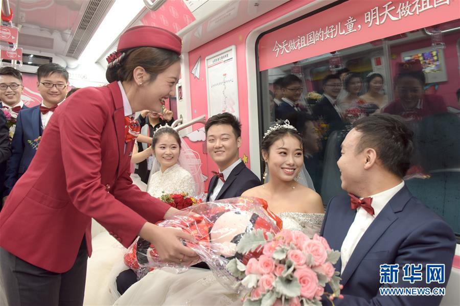 10月18日,在合肥市地鐵一號線,新人們準(zhǔn)備乘坐地鐵。當(dāng)日,中鐵四局集團(tuán)城市軌道交通工程分公司的18對新人在安徽合肥地鐵一號線的車廂里舉行了一場集體婚禮儀式。 新華社記者 郭晨 攝