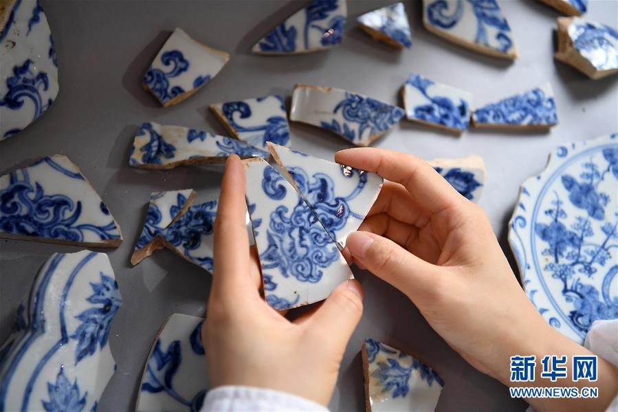 10月18日,在江西景德鎮(zhèn),工作人員修復(fù)明代古瓷片。 新華社記者 萬(wàn)象 攝