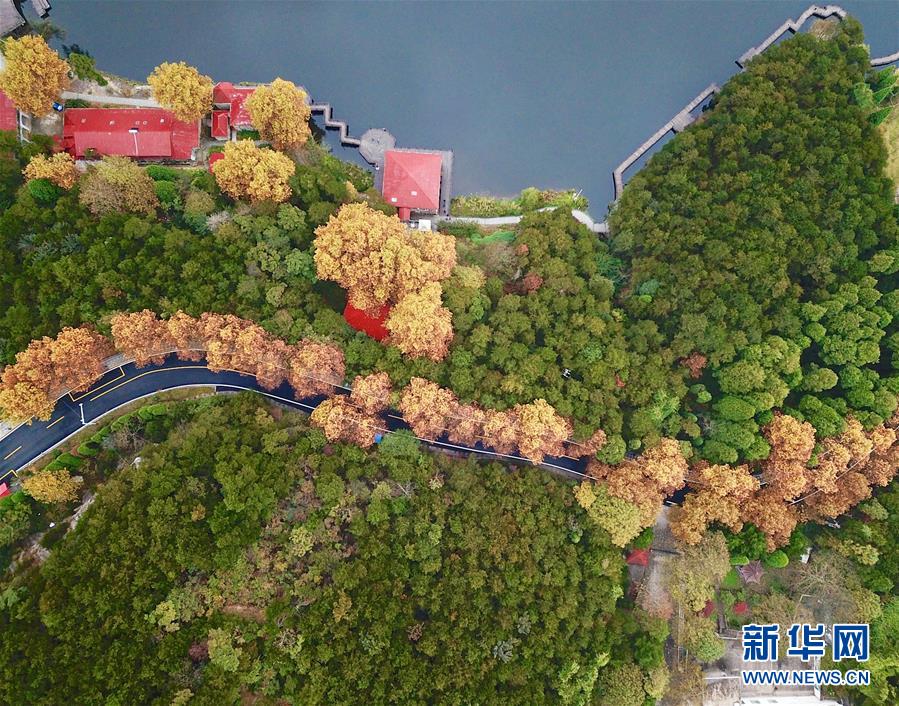 這是如琴湖旁公路的秋色風光(10月20日無人機拍攝)?! ⌒氯A社記者 胡晨歡 攝