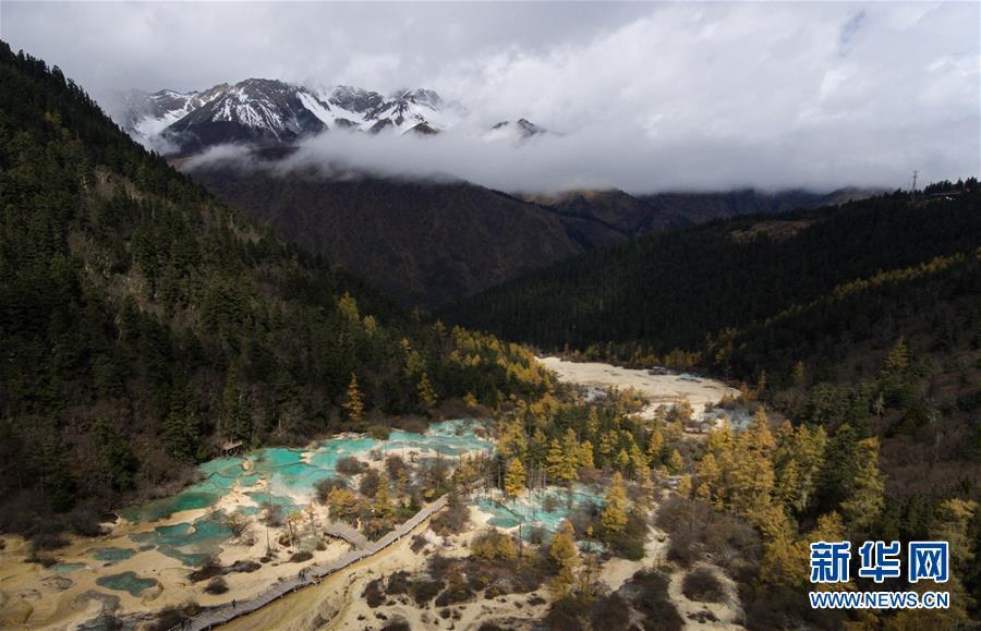 雪山、彩林、彩池構(gòu)成一幅色彩斑斕的畫卷(10月19日無人機拍攝)。深秋時節(jié),在雪山、藍(lán)天、白云和彩林映襯下,黃龍溝中的彩池色彩更加斑斕,目前黃龍景區(qū)進入觀賞最佳時節(jié)。黃龍風(fēng)景名勝區(qū)位于四川省松潘縣境內(nèi),以彩池、灘流、雪山、峽谷、森林等聞名,享有“人間瑤池”“圣地仙境”之美譽。新華社記者 江宏景攝