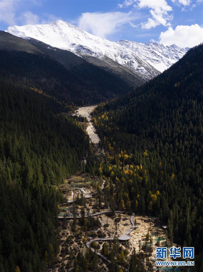 黃龍溝在藍(lán)天白云、雪山和彩林的映襯下風(fēng)景如畫(10月19日無人機(jī)攝)。深秋時節(jié),在雪山、藍(lán)天、白云和彩林映襯下,黃龍溝中的彩池色彩更加斑斕,目前黃龍景區(qū)進(jìn)入觀賞最佳時節(jié)。黃龍風(fēng)景名勝區(qū)位于四川省松潘縣境內(nèi),以彩池、灘流、雪山、峽谷、森林等聞名,享有“人間瑤池”“圣地仙境”之美譽(yù)。新華社記者 江宏景攝