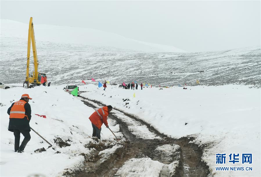 工作人員駕駛大型機(jī)械在昌都市江達(dá)縣的高山牧場(chǎng)上搶通道路(10月14日攝)。新華社記者 劉東君 攝