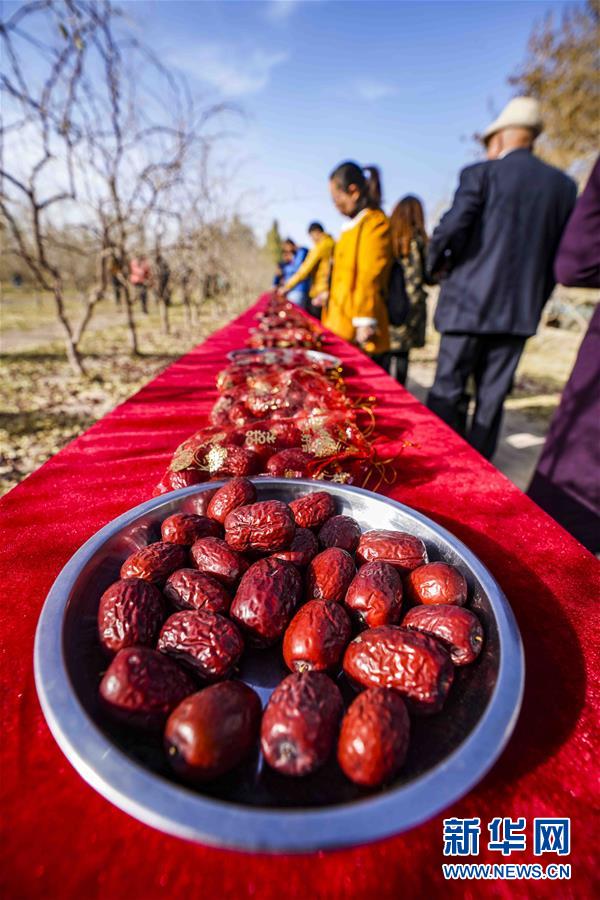 10月20日,在且末縣阿熱勒鎮(zhèn)有機(jī)紅棗園里,紅棗經(jīng)銷商在品嘗紅棗。 新華社記者 趙戈 攝