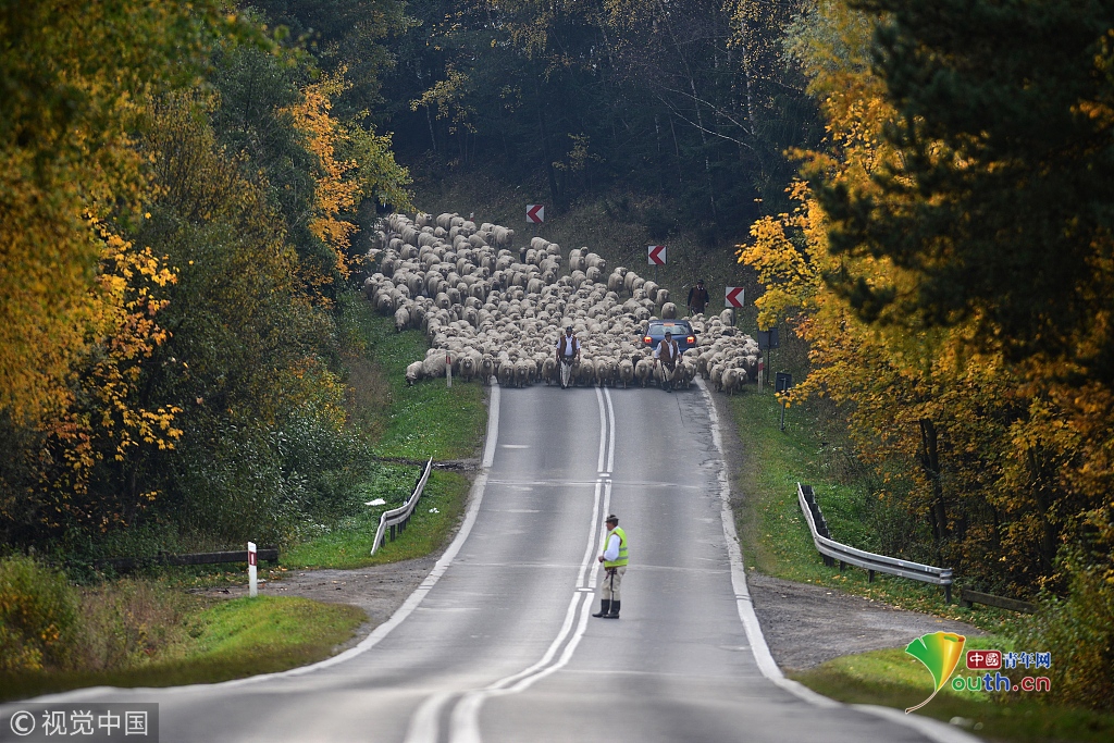 2018年9月27日訊(具體拍攝時(shí)間不詳),波蘭,浩浩蕩蕩的綿羊大軍為了趕在冬天之前回到農(nóng)場(chǎng)過冬,阻斷了鄉(xiāng)村的主車道。
