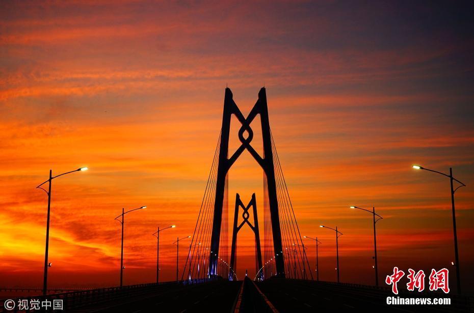 2018年7月18日,珠海,滿天紅霞,亮燈后的港珠澳大橋跨立在伶仃洋上,進(jìn)入通車前的最后準(zhǔn)備。張由瓊 攝 圖片來源:視覺中國