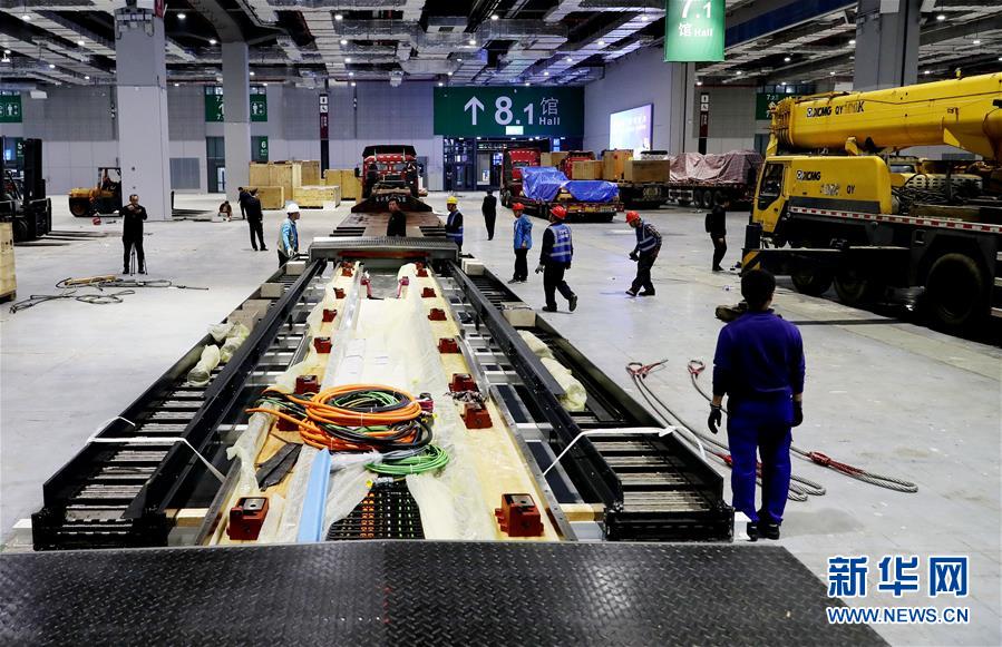 10月22日,“金牛座”龍門銑床床身(前)等待裝運。 當(dāng)日,來自德國的首屆進口博覽會最大展品——“金牛座”龍門銑床完成初步組裝,將運往國家會展中心(上海)3號館進行最后的安裝施工。這是德國瓦德里??票す狙邪l(fā)的機床設(shè)備,高約8米,占地面積約200平方米,將在智能及高端裝備區(qū)進行展出。 新華社記者方喆攝