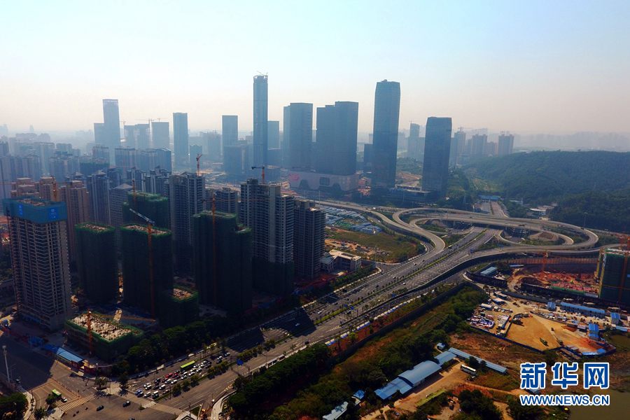 廣西南寧五象新區(qū)地處邕江之南,東起八尺江,西鄰水塘江,北起邕江,南望濱海,規(guī)劃面積約200平方公里。新區(qū)將規(guī)劃建設(shè)成為南寧市構(gòu)建區(qū)域性商貿(mào)物流基地、先進(jìn)制造業(yè)基地、面向東盟的大型企業(yè)總部基地及文化交流展示合作的重要樞紐、信息中心及金融中心的重要支撐的現(xiàn)代新城。圖為無人機航拍建設(shè)中的五象新區(qū)(攝于2018年10月7日)。新華網(wǎng)發(fā) 韋秀玲攝