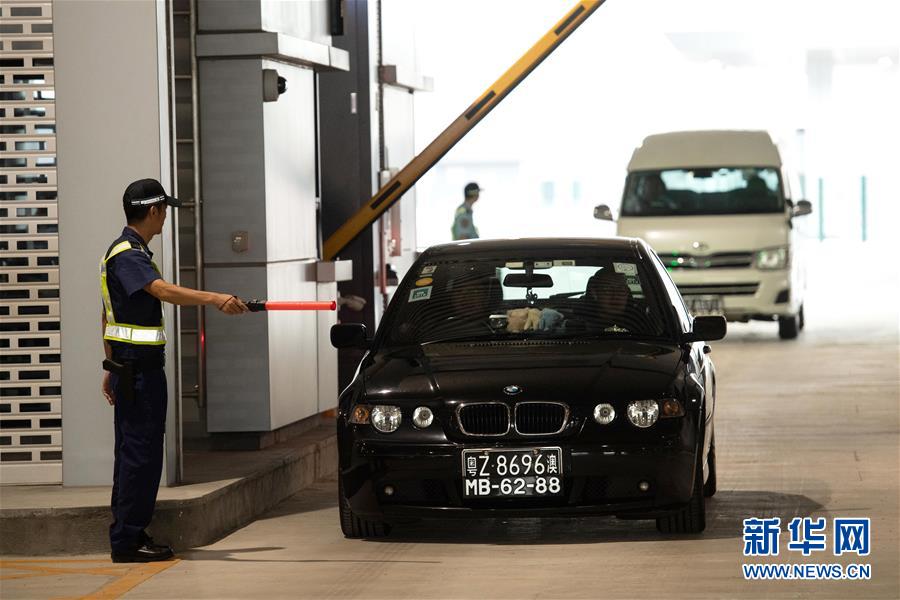 10月24日,首輛私家車行駛在澳門口岸入境車道上。當日,港珠澳大橋正式通車。 新華社記者張金加攝