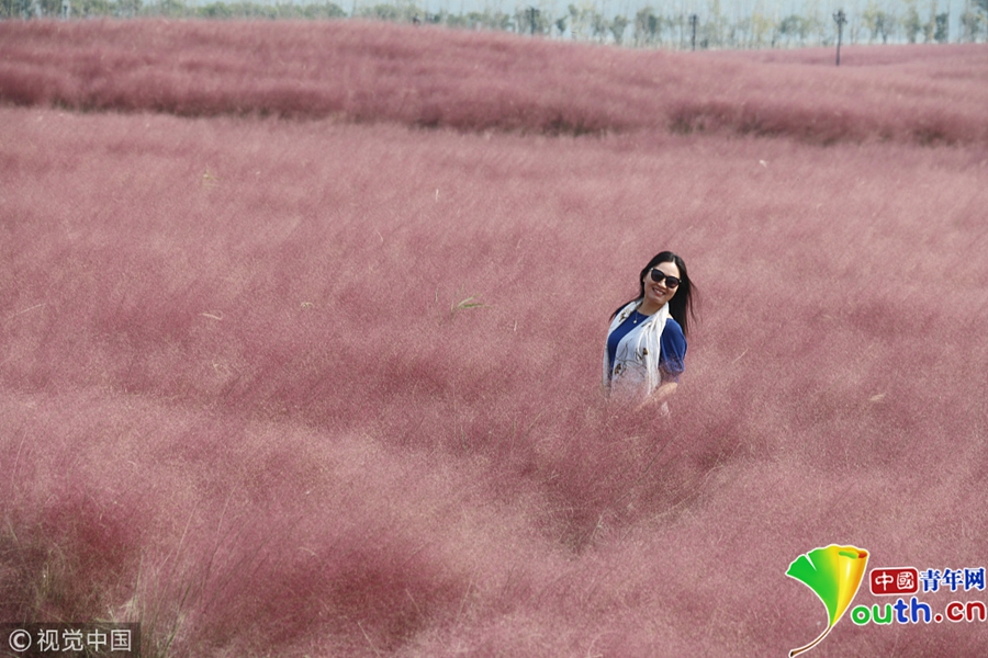 中國青年網(wǎng)北京10月7日電 2018年10月6日,游客在“粉色田野”里游玩、留影。粉黛亂子草是一種觀賞草種,該植物夏季為主要生長季,全株綠色,花期為9月中旬至11月中旬,開花時,綠葉為底,粉紫色花穗如發(fā)絲從基部長出,遠看如紅色云霧。