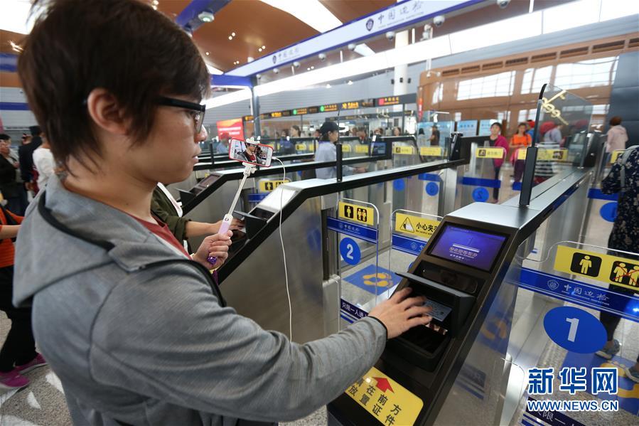 10月24日,一名男子手持自拍桿在自助通道過(guò)關(guān)。 當(dāng)日,港珠澳大橋正式通車(chē)。