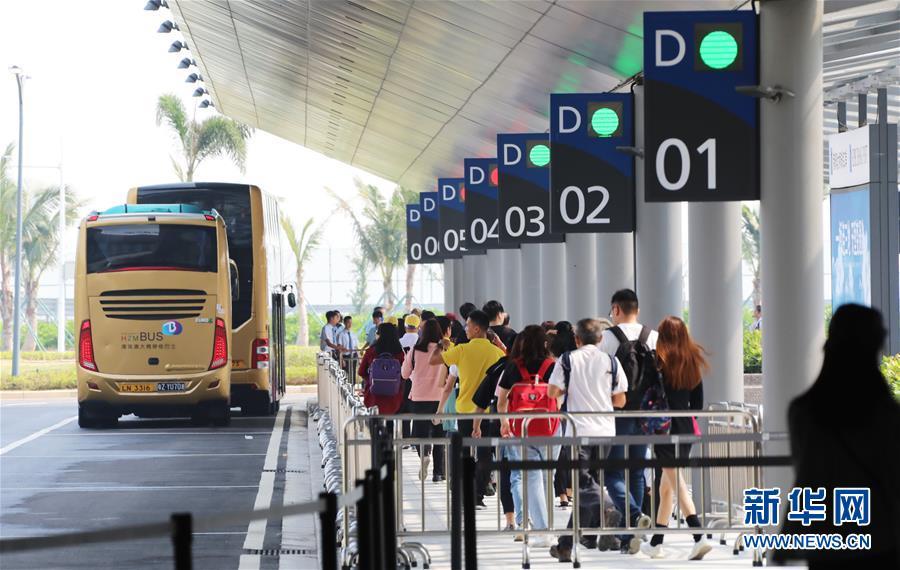 10月24日,跨境巴士在澳門(mén)口岸離境車(chē)道上通關(guān)。當(dāng)日9時(shí),港珠澳大橋正式通車(chē)。 新華社記者張金加攝
