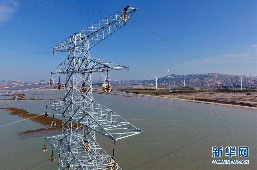 這是建在莆田平海灣上開始架線的輸送風電鐵塔和遠處的東嶠風力發(fā)電場(10月25日無人機拍攝)。 新華社記者林善傳攝