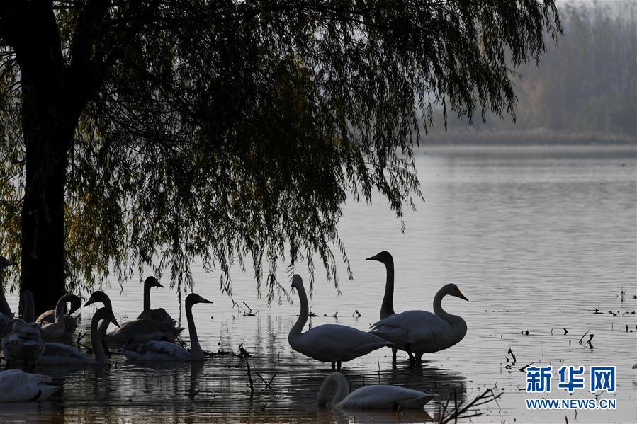 10月30日,大天鵝在山西平陸黃河濕地覓食。新華社記者 楊晨光 攝