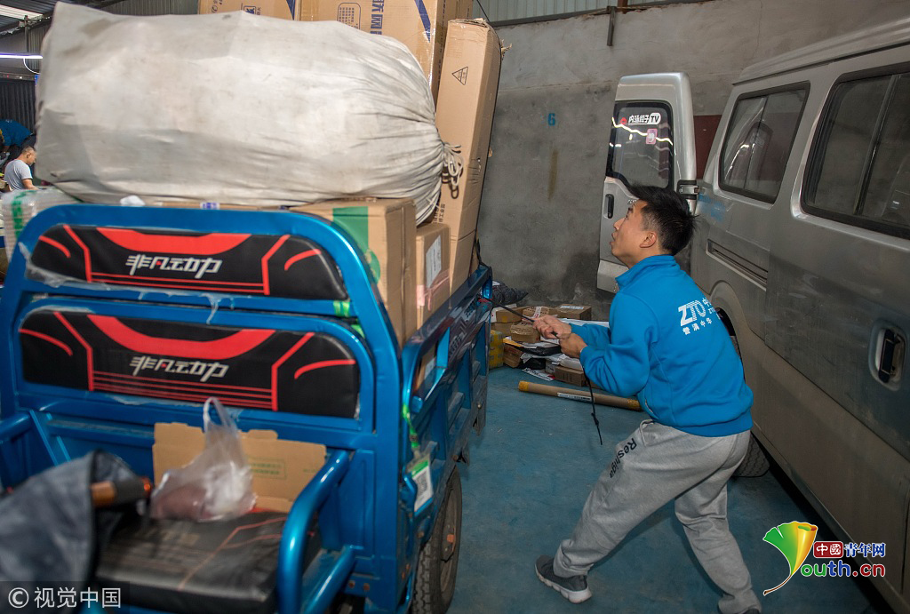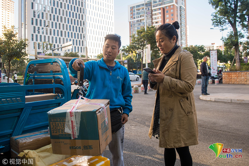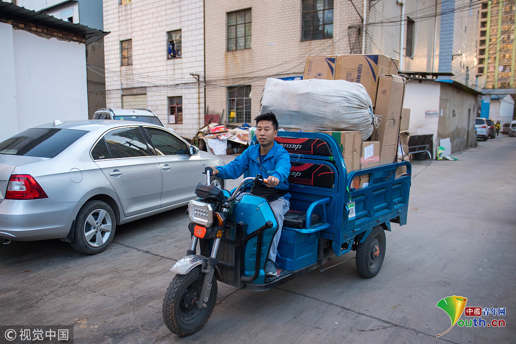 云南省昆明市,攝影師實(shí)拍90后快遞員熊忠桃的一天工作。作為一名快遞員,他25歲就買(mǎi)了房。圖片作者:銳圖