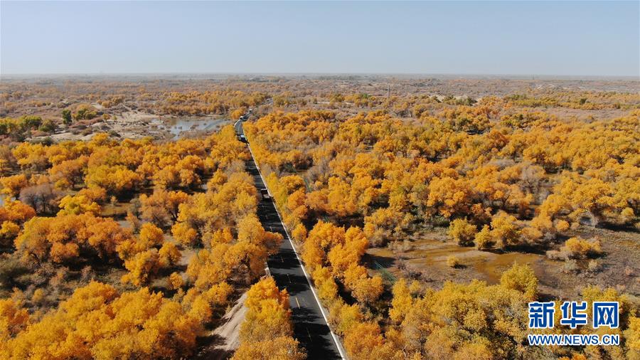 這是在內(nèi)蒙古自治區(qū)額濟(jì)納旗拍攝的胡楊林(10月10日無人機(jī)拍攝)。 金秋時(shí)節(jié),內(nèi)蒙古自治區(qū)額濟(jì)納旗胡楊林如同披上金裝,成為大漠中的一抹亮色,吸引眾多中外游客前來觀賞游玩。 新華社記者鄒予攝