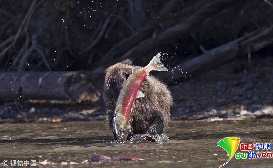 小棕熊成功捉到紅色鮭魚。