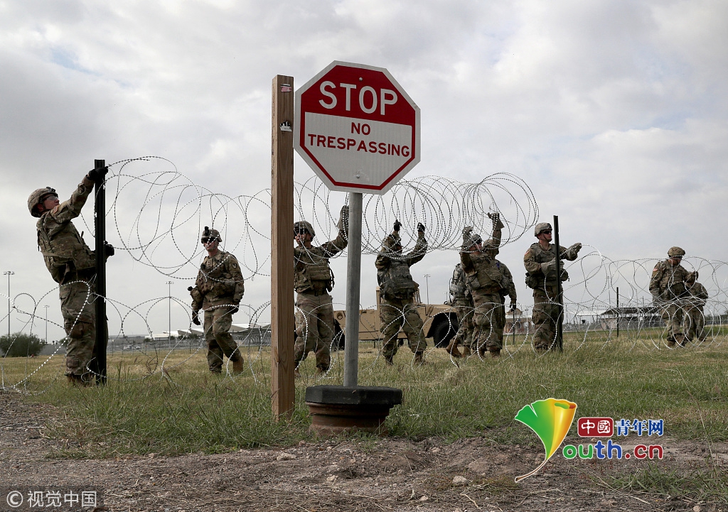 美國士兵在鋪設鐵絲網(wǎng)。