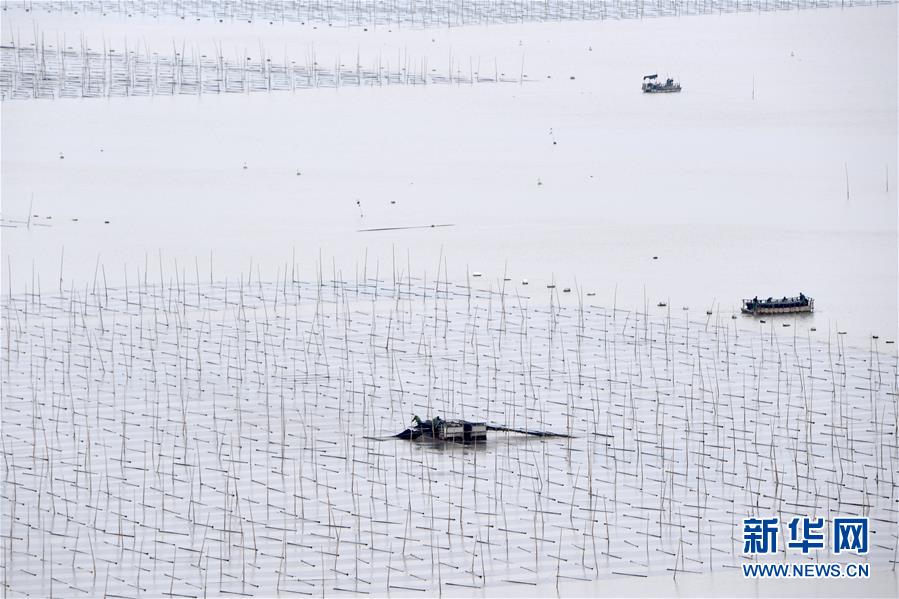 11月4日,漁民在霞浦縣三沙鎮(zhèn)的紫菜種植區(qū)收獲紫菜。 近日,福建省霞浦縣沿海6萬(wàn)畝紫菜迎來(lái)收獲季節(jié),漁民們出海收獲紫菜,海上田園一派繁忙豐收景象。 新華社記者 姜克紅 攝