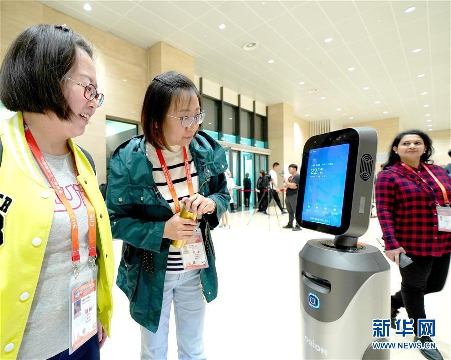 11月4日,媒體記者在首屆中國國際進(jìn)口博覽會(huì)新聞中心和引導(dǎo)機(jī)器人互動(dòng)。 新華社記者陳建力攝