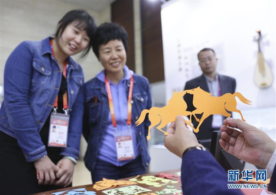 11月4日,在首屆中國國際進(jìn)口博覽會(huì)新聞中心,媒體記者觀看中國傳統(tǒng)剪紙技藝展示。 新華社記者蘭紅光攝