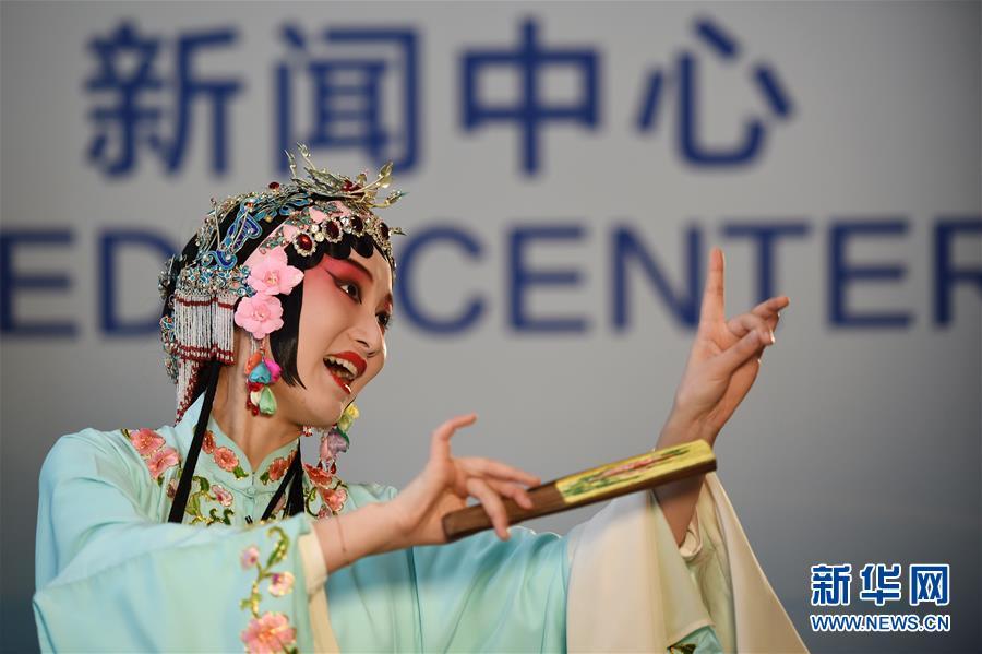11月4日,在首屆中國國際進(jìn)口博覽會(huì)新聞中心,演員展示昆曲藝術(shù)。新華社記者 韓瑜慶 攝