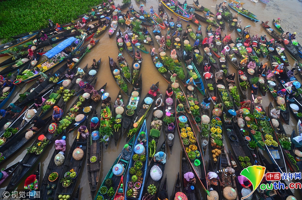 數(shù)以百計的小販們乘坐小船聚集在水上集市,出售他們親手采摘的新鮮果實和蔬菜,他們的衣著和貨物融合出令人驚嘆的色彩盛宴。 圖片來源:視覺中國