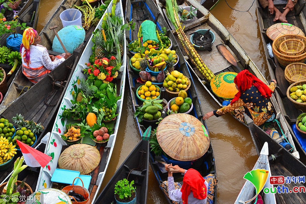 富有煙火氣息的印尼水上集市 商販用獨木舟載貨