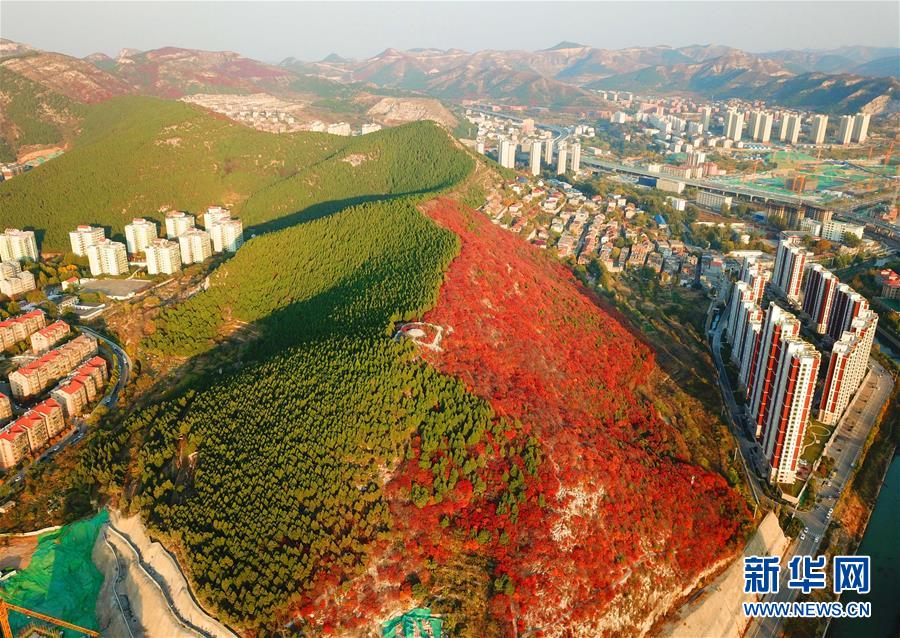 這是“一山雙色”的山東濟南楔子山(10月31日無人機拍攝)。 新華社記者朱崢攝