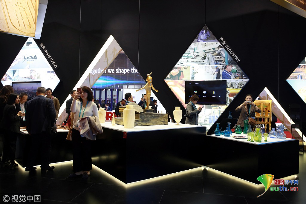 2018年11月6日,上海,首屆中國國際進(jìn)口博覽會(huì)國家展上,共有82個(gè)國家、3個(gè)國際組織設(shè)立了71個(gè)展臺(tái)。埃及館。視覺中國