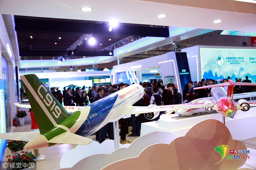 2018年11月6日,上海,首屆中國國際進口博覽會國家展上,共有82個國家、3個國際組織設立了71個展臺。中國館展示的C919飛機。視覺中國