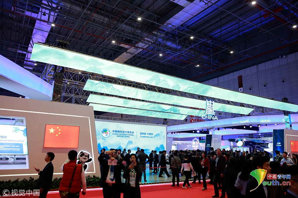 2018年11月6日,上海,首屆中國國際進口博覽會國家展上,共有82個國家、3個國際組織設立了71個展臺。中國館。視覺中國