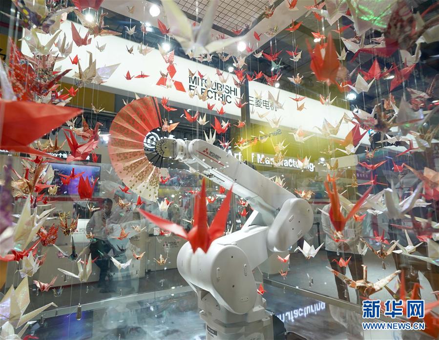 11月6日,日本三菱電機公司展臺上的扇子舞機器人進行表演。 新華社記者 陳建力 攝