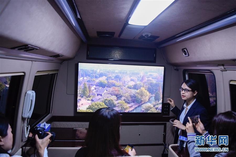 在浙江移動(dòng)烏鎮(zhèn)分水墩營業(yè)廳外,工作人員在一輛體驗(yàn)巴士內(nèi)介紹通過5G移動(dòng)傳輸技術(shù)實(shí)現(xiàn)的8K高清的視頻畫面實(shí)時(shí)展示(10月30日攝)。 新華社記者黃宗治攝