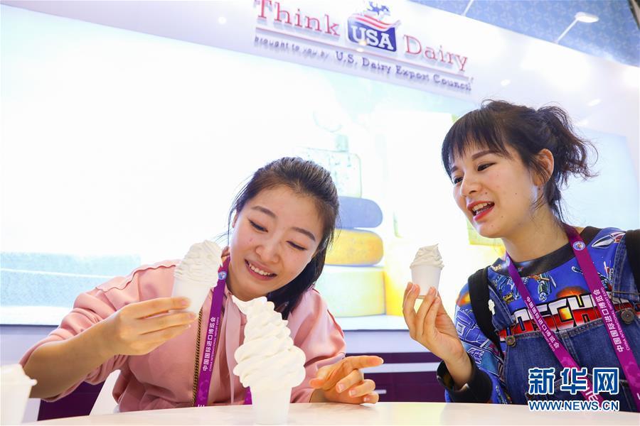 11月7日,兩位參觀者在進(jìn)博會食品及農(nóng)產(chǎn)品展區(qū)美國乳品出口協(xié)會展臺品嘗冰激凌。 新華社記者 劉大偉 攝