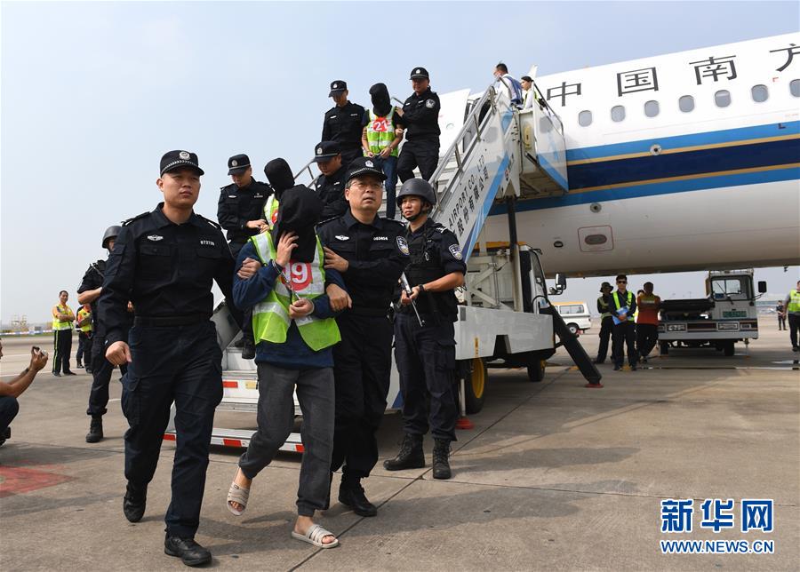 11月7日,在深圳寶安機(jī)場,民警押解犯罪嫌疑人下機(jī)。新華社記者毛思倩攝