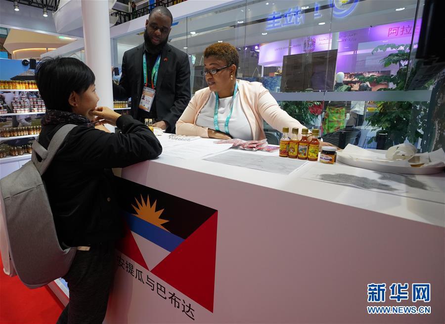 11月8日,在加勒比地區(qū)國(guó)家展區(qū)安提瓜和巴布達(dá)展臺(tái),一名參觀者(左)與工作人員交談。 中國(guó)國(guó)際進(jìn)口博覽會(huì)11月5日在上海開(kāi)幕。國(guó)家貿(mào)易投資綜合展(國(guó)家展)是中國(guó)國(guó)際進(jìn)口博覽會(huì)的重要內(nèi)容,共有82個(gè)國(guó)家、3個(gè)國(guó)際組織設(shè)立71個(gè)展臺(tái)。 新華社記者 程麗 攝