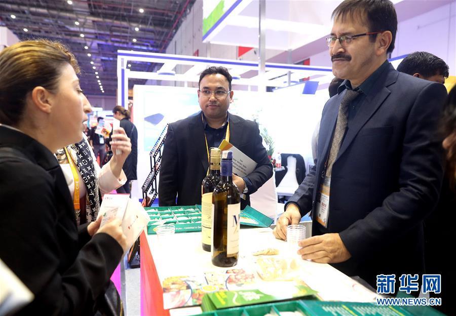 11月7日,印度展區(qū)的工作人員向參觀者進行推介。 中國國際進口博覽會11月5日在上海開幕。國家貿易投資綜合展(國家展)是中國國際進口博覽會的重要內容,共有82個國家、3個國際組織設立71個展臺。 新華社記者 陳飛 攝