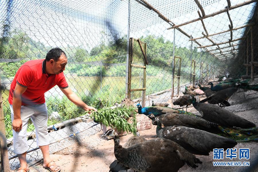 5月16日,在重慶市銅梁區(qū)永嘉鎮(zhèn)高龍村,閻仁兵在養(yǎng)殖場內(nèi)給藍孔雀喂食。 新華社記者 王全超 攝