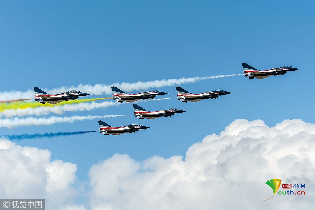 2018年11月8日,廣東珠海,第十二屆中國國際航展第三天。空軍“八一”飛行表演隊的隊員們,發(fā)揚連續(xù)作戰(zhàn)精神,給觀眾們表演了七機分組開花、四機編隊橫滾等高難動作,受到觀眾們的稱贊。視覺中國