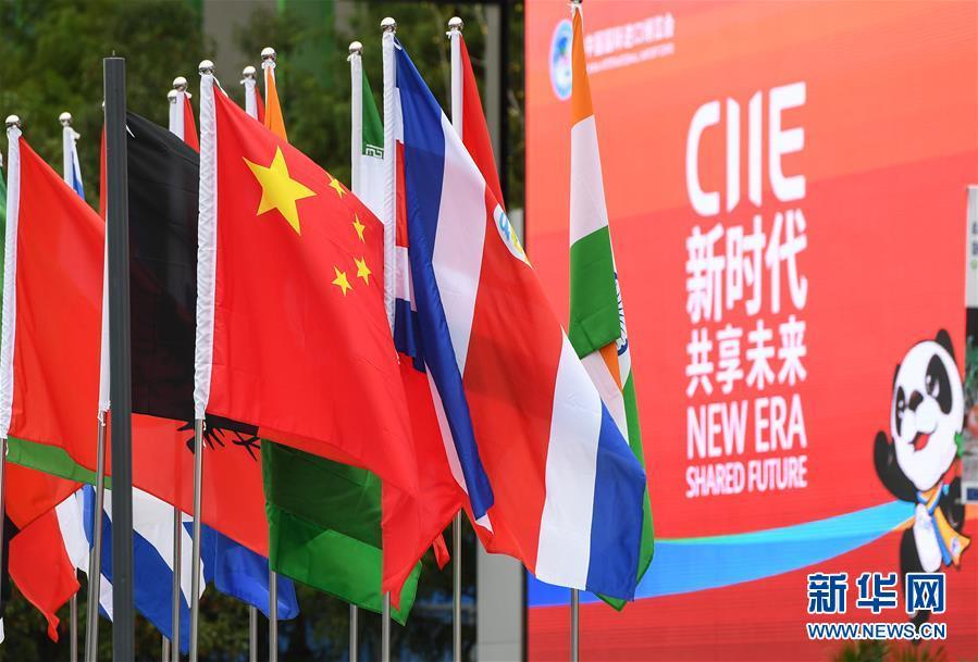 11月5日,在上海國家會展中心入口處,旗幟迎風飄揚。新華社記者 李賀 攝