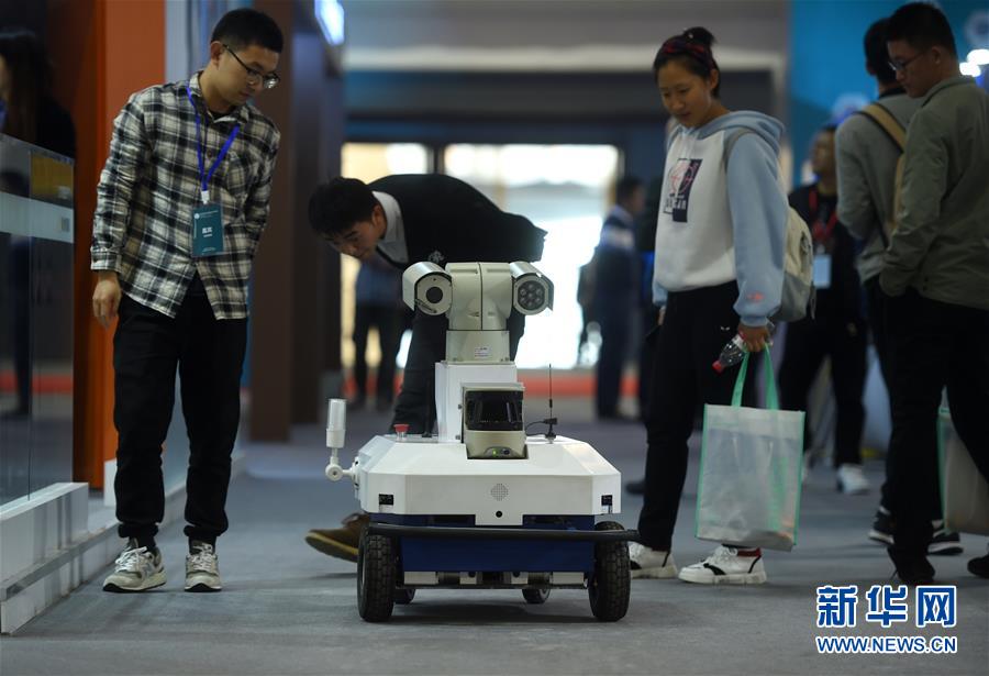 11月10日,人們在展會(huì)現(xiàn)場觀看展出的一款電力巡檢機(jī)器人。