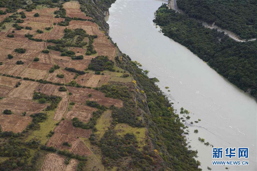 空中俯瞰通往加拉村已淹沒(méi)的公路(10月18日攝)。 新華社記者 普布扎西攝