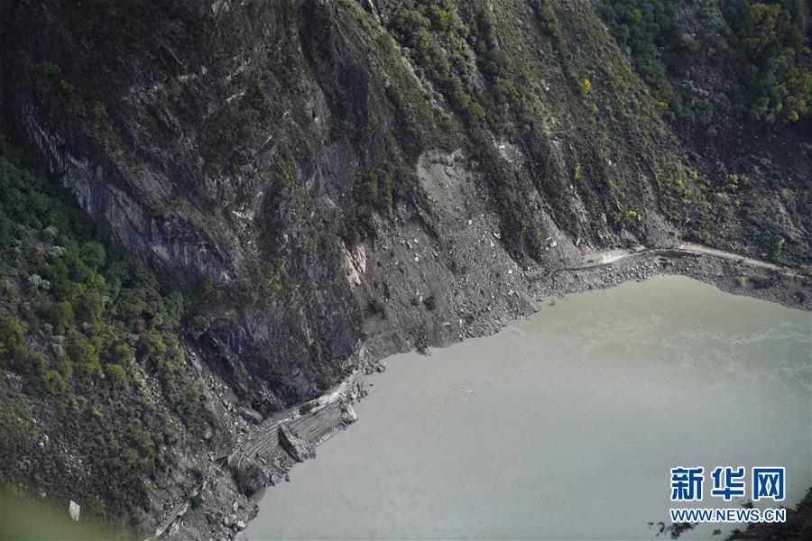 10月20日,西藏雅魯藏布江米林縣堰塞湖自然過流后,露出損毀的道路。 10月19日13時30分,西藏雅魯藏布江米林縣堰塞湖開始自然過流。記者從應急管理部牽頭的聯(lián)合工作組獲悉,截至20日7時,雅魯藏布江堰塞湖壩前水位已下降56米,估算留存水量1.6億立方米,堰塞湖洪水威脅得到緩解,防洪安全風險大大減輕,并將繼續(xù)降低。 10月20日,記者乘坐直升機從空中拍攝了雅魯藏布江堰塞湖自然過流的畫面。 新華社記者普布扎西攝